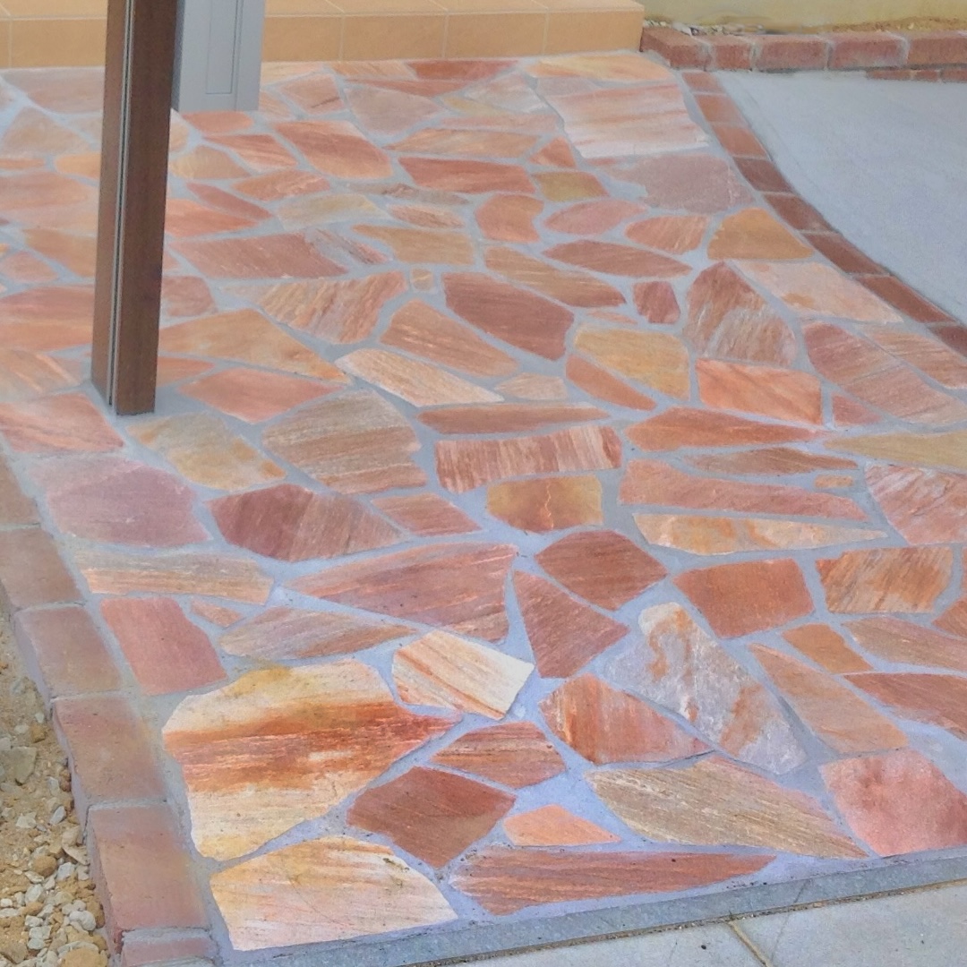 シャッター付き門柱に天然石のアプローチのデザインをしました。