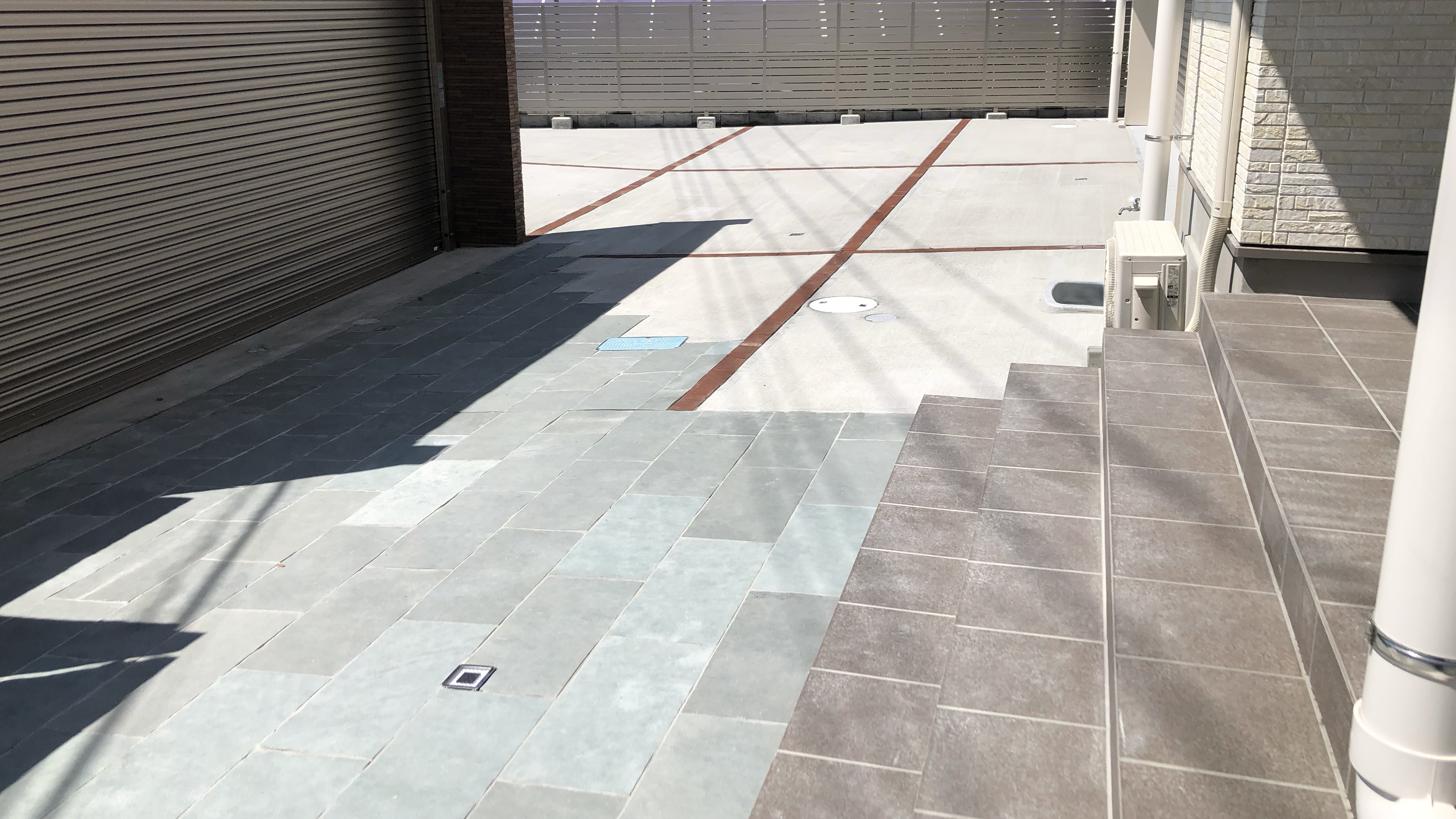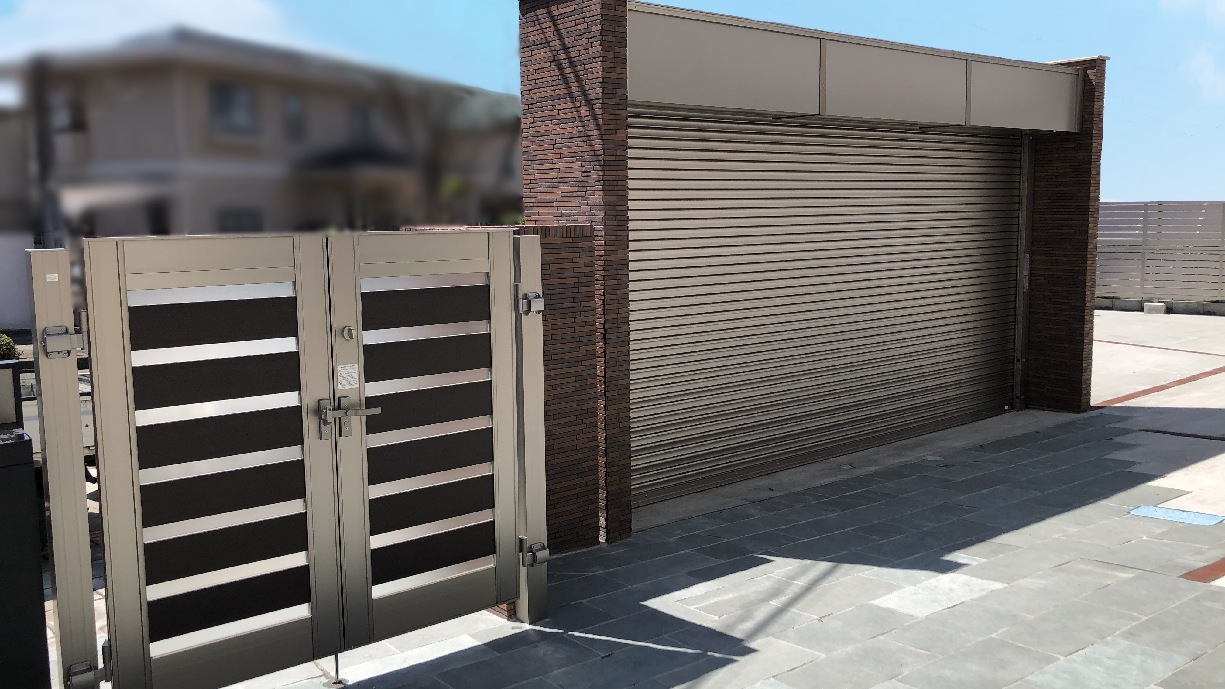 お客様の趣味を生かす家新築外構工事 重厚感と開放感を兼ね備えた外構 重厚感のあるシャッター付き門柱を設置しました。門柱と同じ色合いの門扉や、高さの異なる目隠しフェンスを使用することで、プライベートを確保しつつも、全体の解放感を感じられます。また、全面天然石貼りのアプローチが、敷地から玄関までを上品につなぎ、外構と建物の一体感を演出してくれます。 前のページに戻る