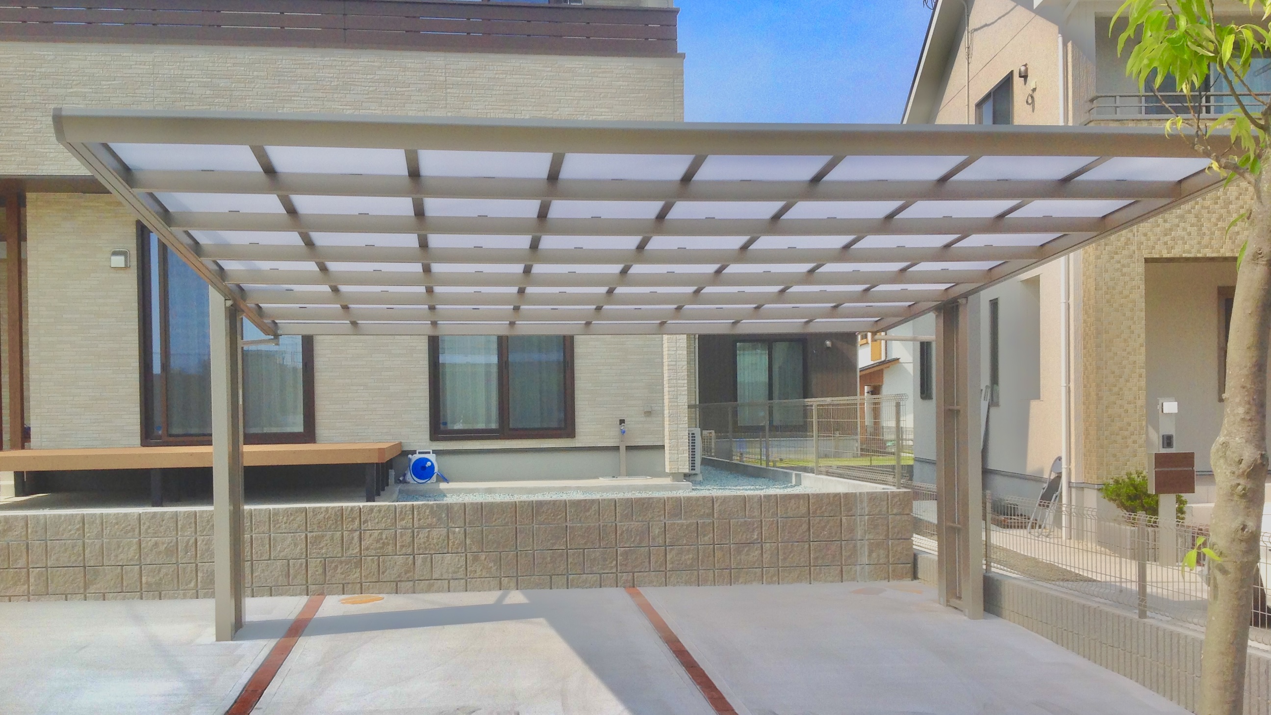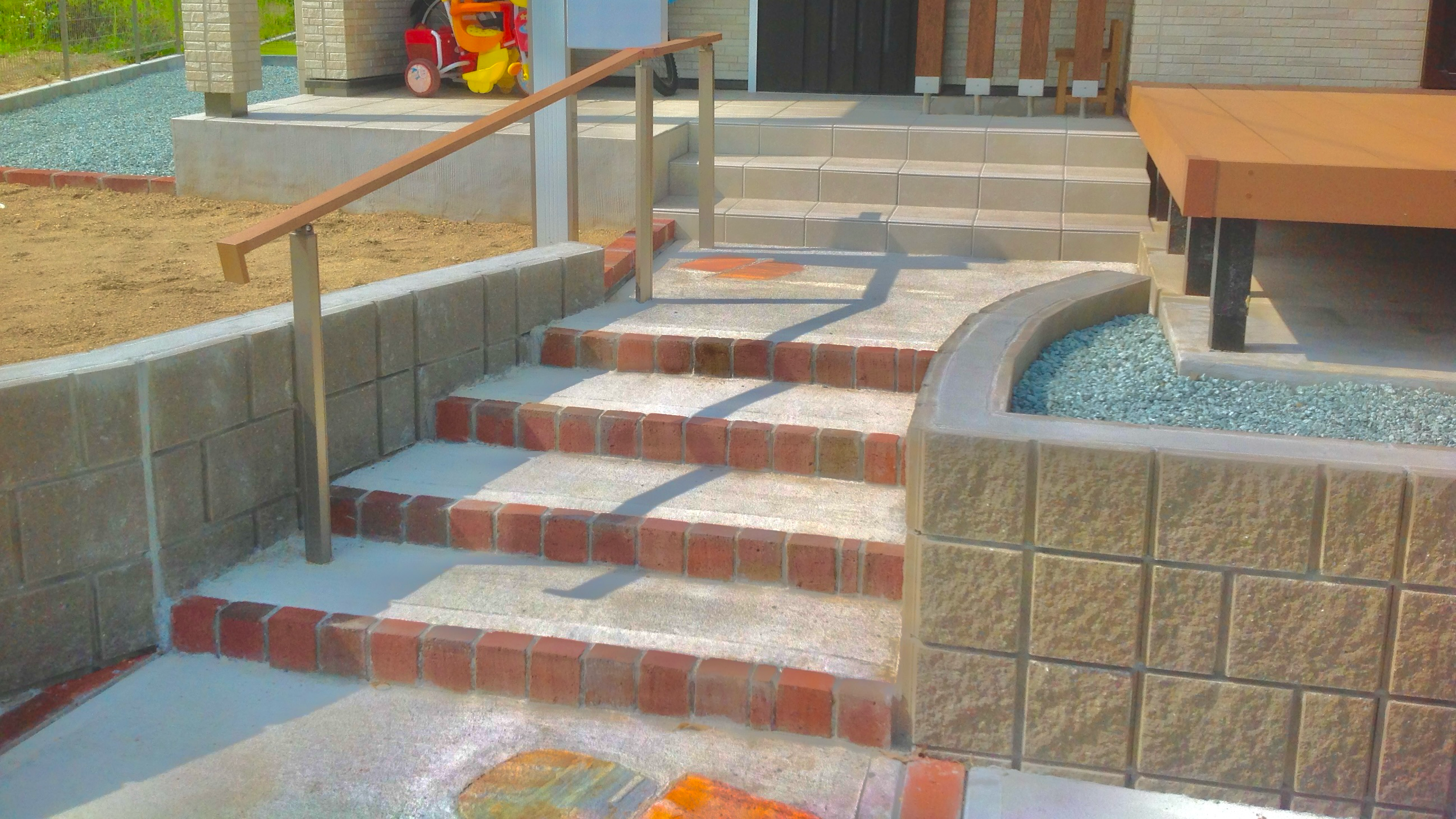 子どもと共に暮らす家新築外構工事 暮らしやすくおしゃれなエクステリア 化粧RECOMを使うことで、土留の部分をおしゃれに仕上げました。 階段のけあげにはアクセントとしてレンガを使用。 駐車場は、後ろにのみ支柱があるタイプのカーポートにすることで、駐車しやすい空間を作り上げております。 前のページに戻る